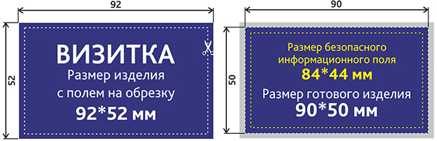 Размер визитки с припусками на обрез 92x52 мм (т.е. по 1 мм с каждого края);